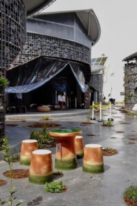 万博の事業、Co-Design Challenge というプロジェクトで、信楽焼産地の連携により窯業系廃棄物のリサイクル資源化と琵琶湖の生き物をモチーフにデジタル技術を活用し、多様な対話や文化の共創に繋がるアップサイクル製品として、陶製テーブル、スツールを開発し、万博会場に提供しています。